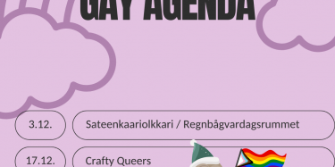 Sateenkaariolkkarit ovat avoimia tapaamisia, säännöllisesti kuun ensimmäisenä keskiviikkona. Ne ovat ikärajattomia eikä niihin tarvitse ilmoittautua ennakkoon. Sinun ei tarvitse olla jäsen osallistuaksesi. Sateenkaariolkkarissa 5.11. katsotaan yhdessä jakso Suomi on queer-dokumentista ja keskustellaan aiheesta. Tule viettämään mukavaa keskiviikkoiltaa meidän kanssa klo 18-20, Kumppanuustalo Myötätuulessa, Jokikatu 7. Tilat löytyvät 2. kerroksesta. Sisäänkäynti Jokikadun puolelta ja esteetön käynti Laivurinkadulta …
