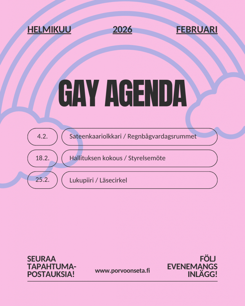 Helmikuun Sateenkaariolkkari on keskiviikkona 4.2. klo 17-19 ja ohjelmassa lautapelien ja korttipelien pelaamista. Olkkariin voi tietenkin tulla ihan vain viihtymÀÀn vaikka teekupin ÀÀrelle, ellei pelaaminen innosta. Tule viettĂ€mÀÀn mukavaa keskiviikkoiltaa meidĂ€n kanssa Kumppanuustalo MyötĂ€tuulessa, Jokikatu 7. Tilat löytyvĂ€t 2. kerroksesta. SisÀÀnkĂ€ynti Jokikadun puolelta ja esteetön kĂ€ynti Laivurinkadulta sisĂ€pihalta. Molemmista ovista pÀÀsee 18.00 jĂ€lkeen sisÀÀn summeria soittamalla.Â