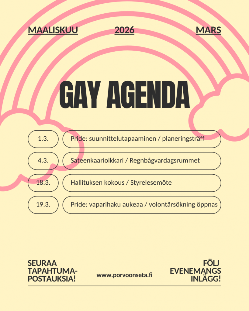 đłïžâđ Tule tekemÀÀn kanssamme unohtumatonta tapahtumaviikkoa, joka tuo nĂ€kyvĂ€ksi sukupuoli- ja seksuaalivĂ€hemmistöjen oikeuksia Porvoossa.