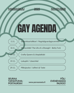 Tiistaina 3.12.24 Sateenkaariolkkari kokoontuu Porvoon Paahtimolla (Mannerheimink 2) klo 18.00, toisessa kerroksessa.På tisdagen 3.12.24. samlas Regnbågsvardagsrummet på Porvoon Paahtimo (Mannerheimg 2) kl. 18.00, på andra våningen. Virkkaa ihan homona kokoontuu Kumppanuustalo Myötätuulessa (Jokikatu 7, 2 krs) ke 4.12.24, klo 17-19.Virka helt homona samlas på ons 4.12.24, kl. 17-19 på Kompanjonskapshuset Medvind (Ågatan 7, 2. vån.) …