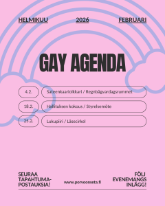 Tiistaina 3.12.24 Sateenkaariolkkari kokoontuu Porvoon Paahtimolla (Mannerheimink 2) klo 18.00, toisessa kerroksessa.På tisdagen 3.12.24. samlas Regnbågsvardagsrummet på Porvoon Paahtimo (Mannerheimg 2) kl. 18.00, på andra våningen. Virkkaa ihan homona kokoontuu Kumppanuustalo Myötätuulessa (Jokikatu 7, 2 krs) ke 4.12.24, klo 17-19.Virka helt homona samlas på ons 4.12.24, kl. 17-19 på Kompanjonskapshuset Medvind (Ågatan 7, 2. vån.) …